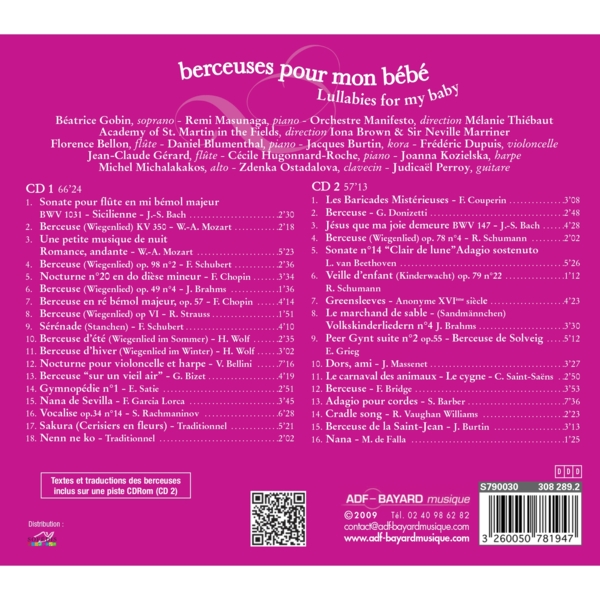 Les plus belles berceuses allemandes (Strauss, Brahms, Schumann, Schubert), anglaises (Vaughan Williams, Bridge), françaises (Massenet, Bizet), italiennes et espagnoles se mêlent à de magnifiques adagios pour endormir bébé. Une sélection originale et particulièrement... reposante !