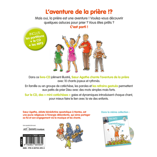Dans ce livre-CD joliment illustré, sœur Agathe chante l’aventure de la prière avec 10 chants joyeux et rythmés. En famille ou en groupe de catéchèse, les paroles et les refrains gestués permettent aux petits de prier Dieu avec des mots simples mais forts.