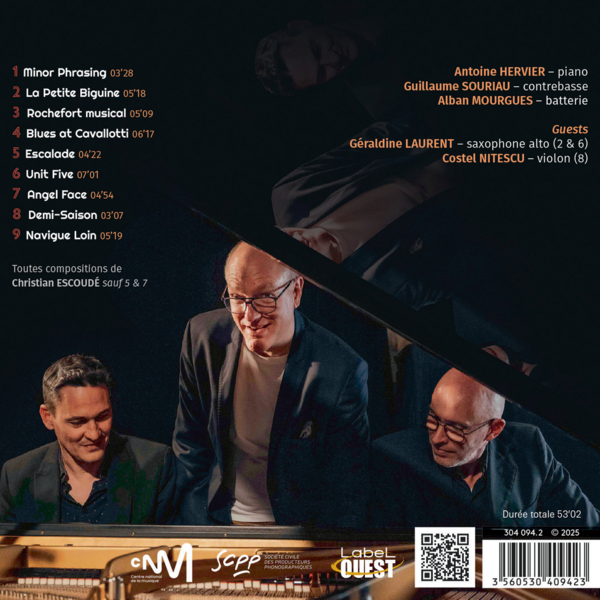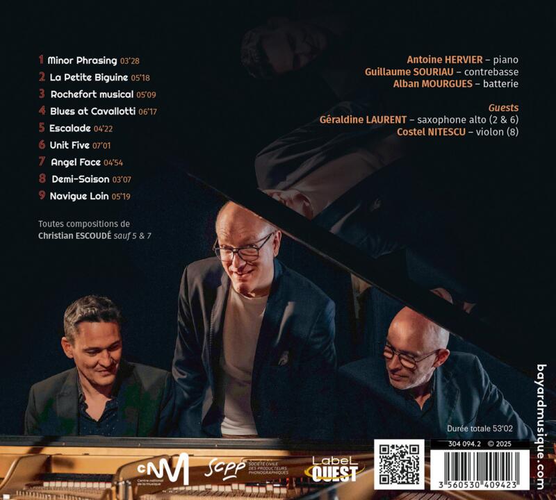 À travers des arrangements sensibles et une interprétation habitée, Antoine Hervier fait résonner l'héritage de son mentor tout en affirmant sa propre voix. Certaines pièces ont été travaillées en lien direct avec le compositeur, donnant au projet une légitimité rare. Le disque s'achève sur Escalade, une composition inédite d'Hervier, comme un dernier salut au maître. “Navigue loin” – du titre d'une composition d'Escoudé – devient ici un mot d'ordre : celui d'une musique qui trace son chemin entre fidélité et invention, mémoire et modernité.