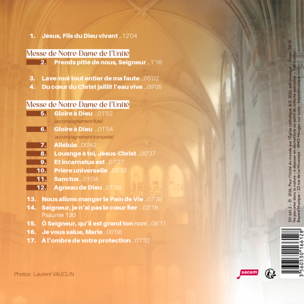 Ce premier volume comprend un ordinaire de messe (la messe de Notre-Dame de l'Unité) ainsi que quelques autres chants dont un chant de communion, deux chants d'entrée ou d'envoi, deux chants à Marie dont un "Je vous salue, Marie", etc.