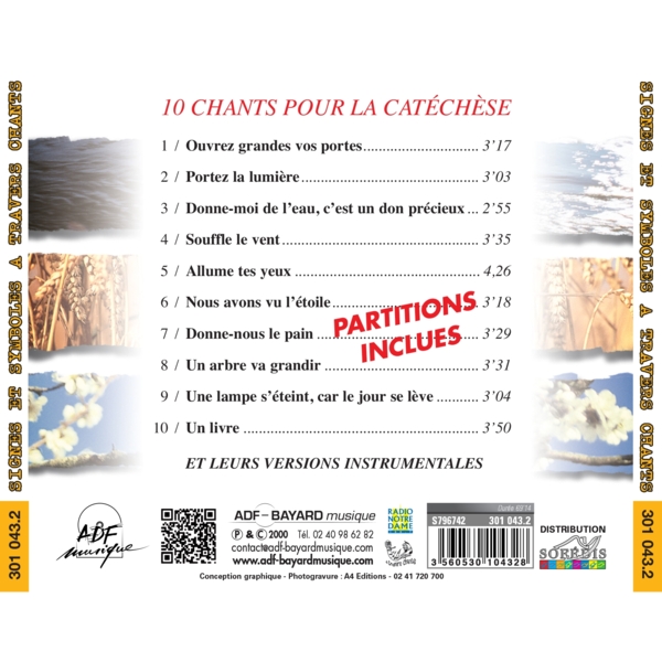 Danielle Sciaky, Marie-Louise Valentin et Hubert Bourel nous proposent 10 chants sur les signes et symboles utilisés en liturgie : l'eau, la lumière, le vent, le pain, les couleurs. Idéal pour les 8-12 ans.