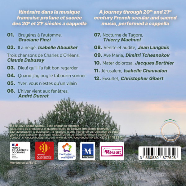 De la Terre et du Ciel offre un parcours vocal inédit à travers la musique chorale française des 20e et 21e siècles, entièrement a cappella. Ce programme réunit des œuvres rares, connues ou inédites.